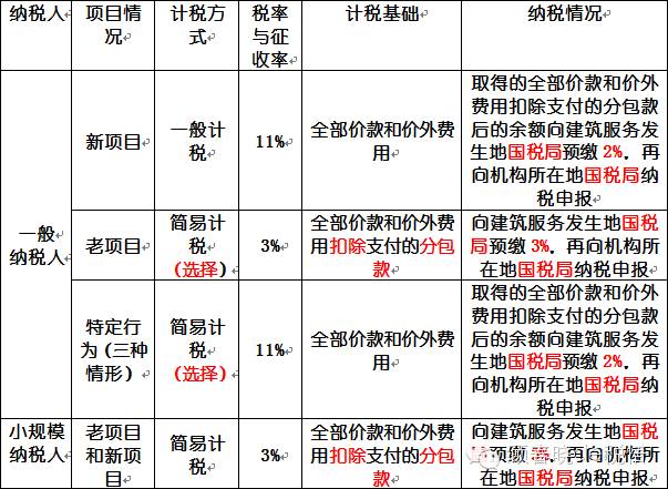 2.對于一般納稅人,情況就比較復雜。首先是老項目,可以選擇一般計稅和簡易計稅。分別適用11%稅率和3%征收率。對于新項目,一般情況下,適用一般計稅方式。但是在過渡期,建筑企業一般納稅人的特定應稅行為可以選擇簡易計稅方法。